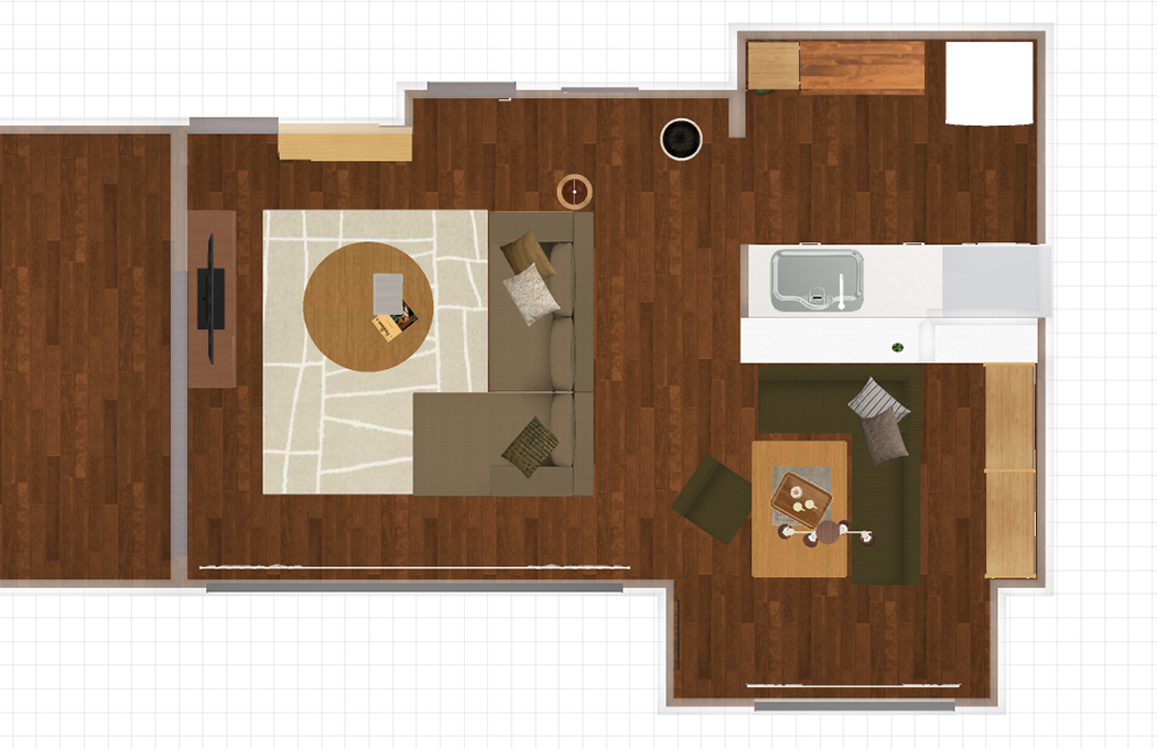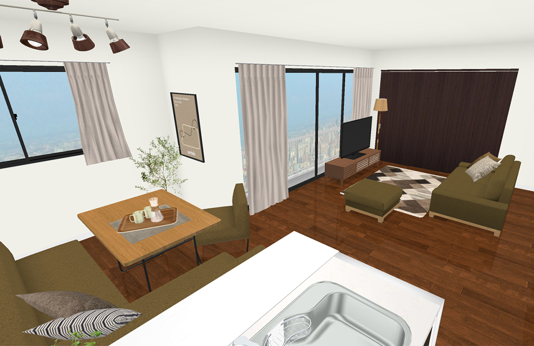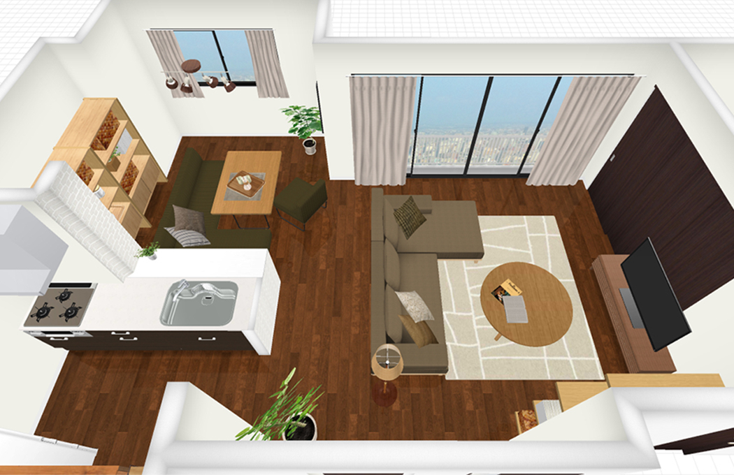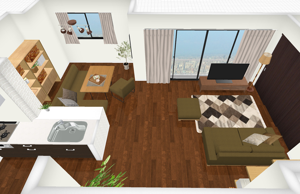 | 伝えたい内容など | 今のレイアウトだと、ダイニングに二人座っていると、 あと一人はソファーに座り、家族が分断された感じになるのがちょっと、、、 と思っています。 同じマンションに住む次女やその子どももよく来るので、 みんなでゆったりと大きなひとつの輪になってくつろげるような レイアウトを是非ご提案いただければと思います。 |