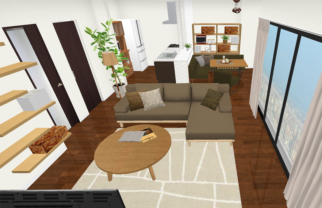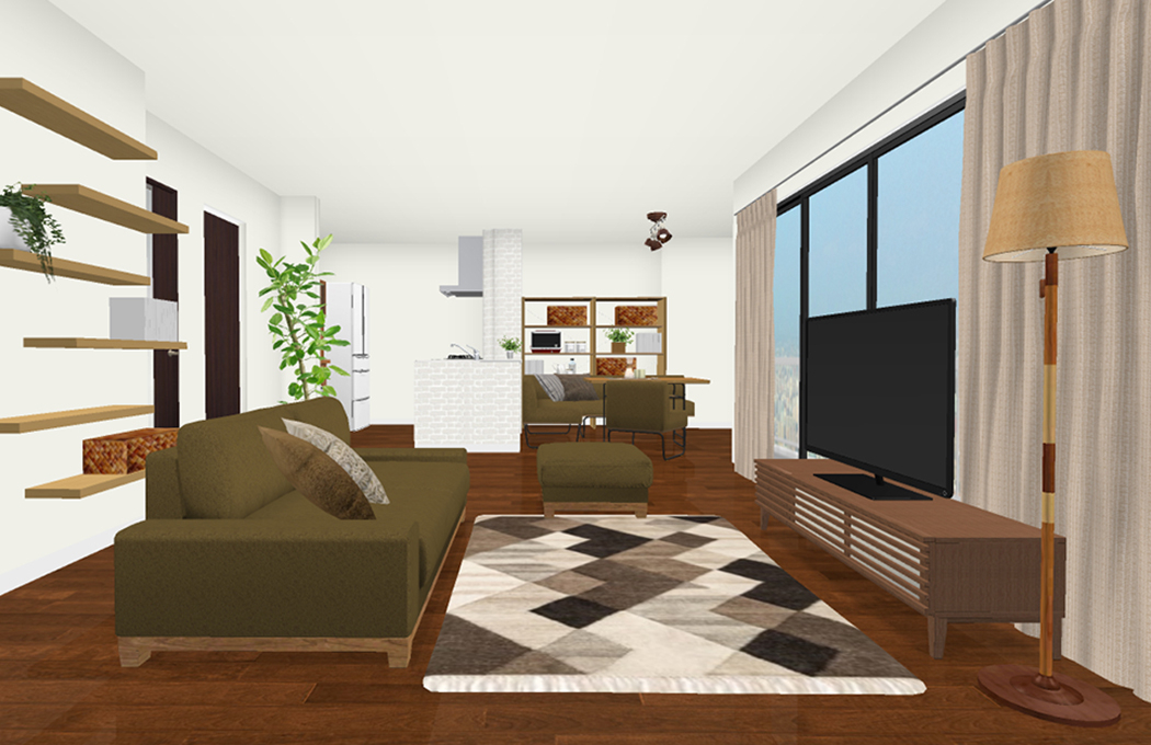 3D上でのテレビサイズは50インチ、TVボードはなるべく導線を確保するために、コンパクトな幅150cmのタイプでレイアウトしています。