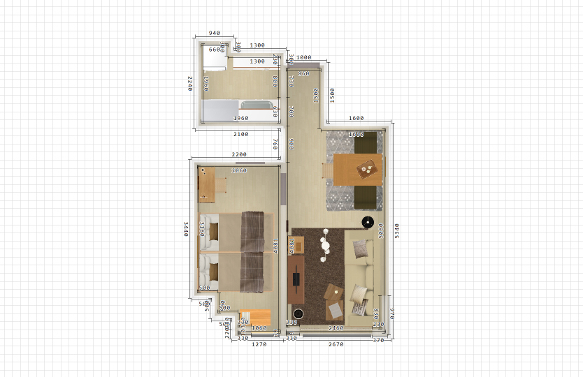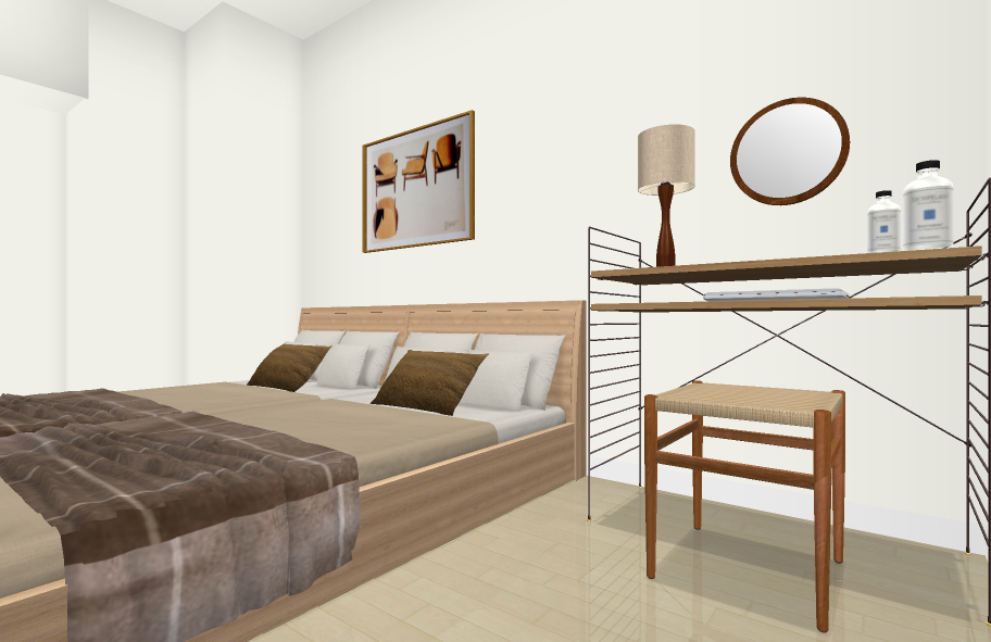 寝室にはお持ちのベッドや収納棚以外に、デスク兼ドレッサーをレイアウトいたしました。