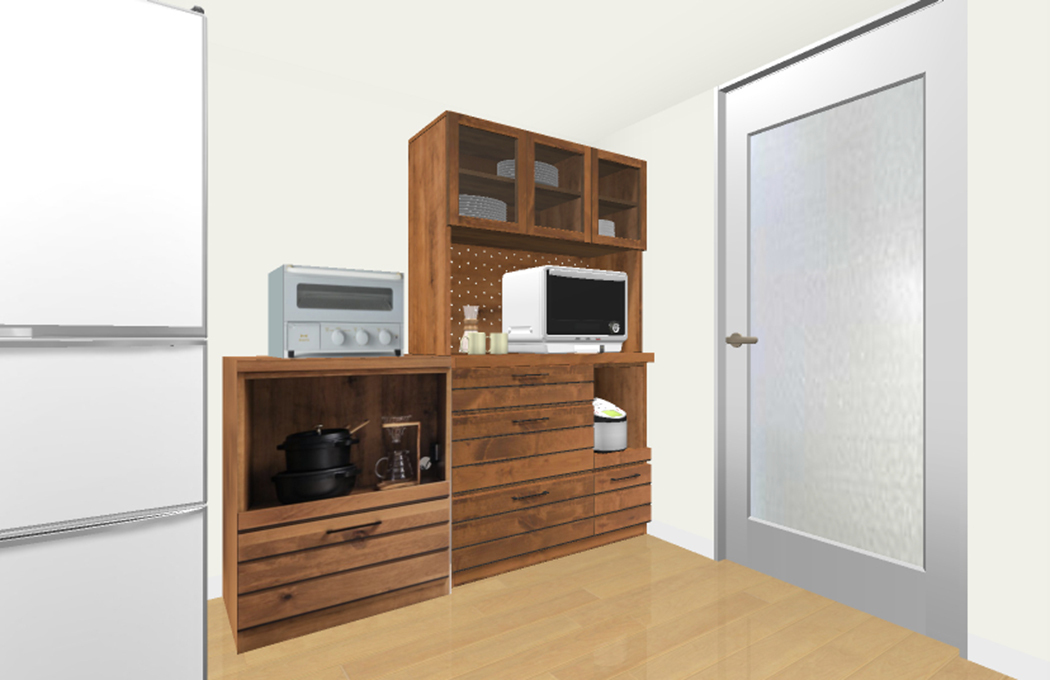 キッチン収納については、ご希望のサイズ、またお持ちの家電を参考に総幅175cmのキッチン収納をレイアウトいたしました。