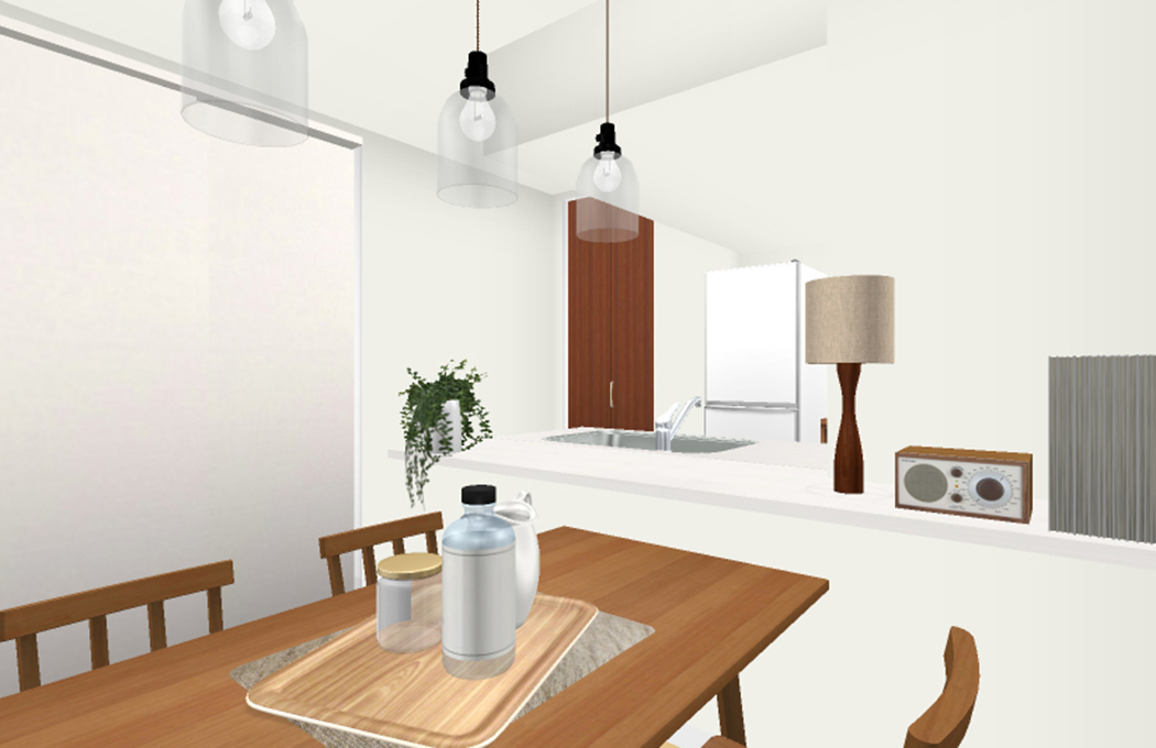そのため、キッチン収納や、プラス提案させていただくサイドテーブル、照明などは、ミッドブラウンのカラーで統一しております。
