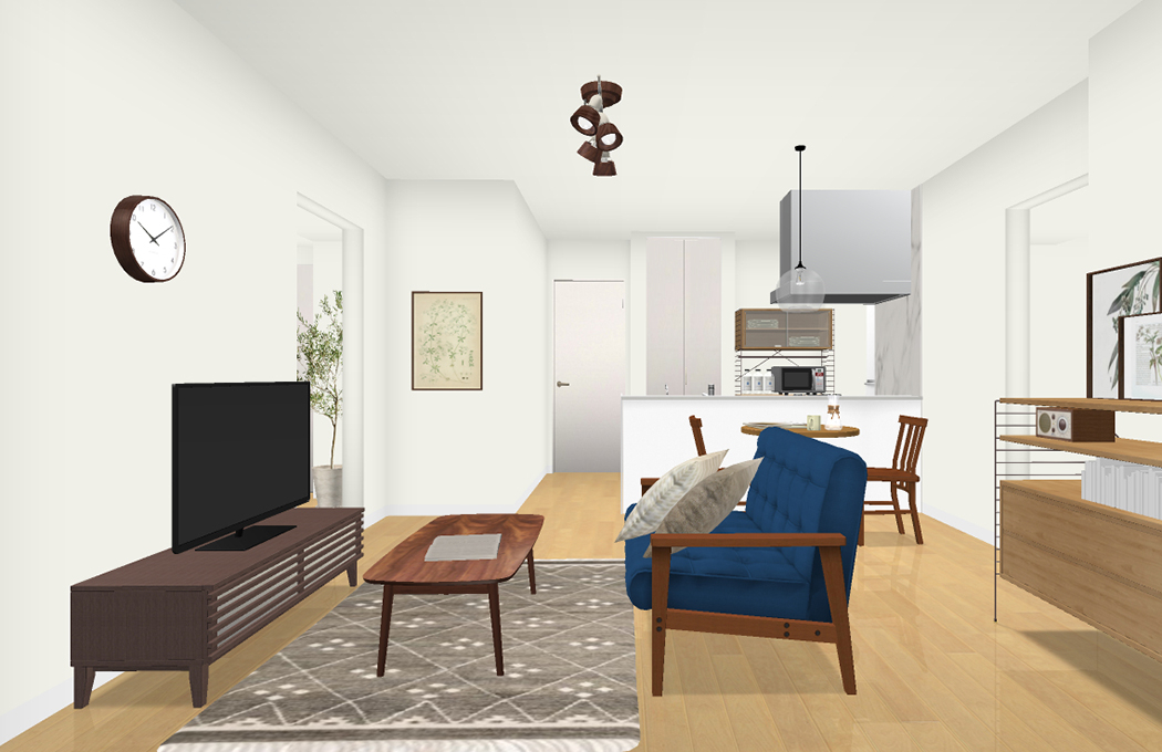 ベースになる内装のホワイト、木製のブラウンカラーが統一され、そこにブルーのソファーがアクセントになります。
