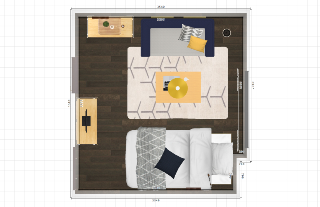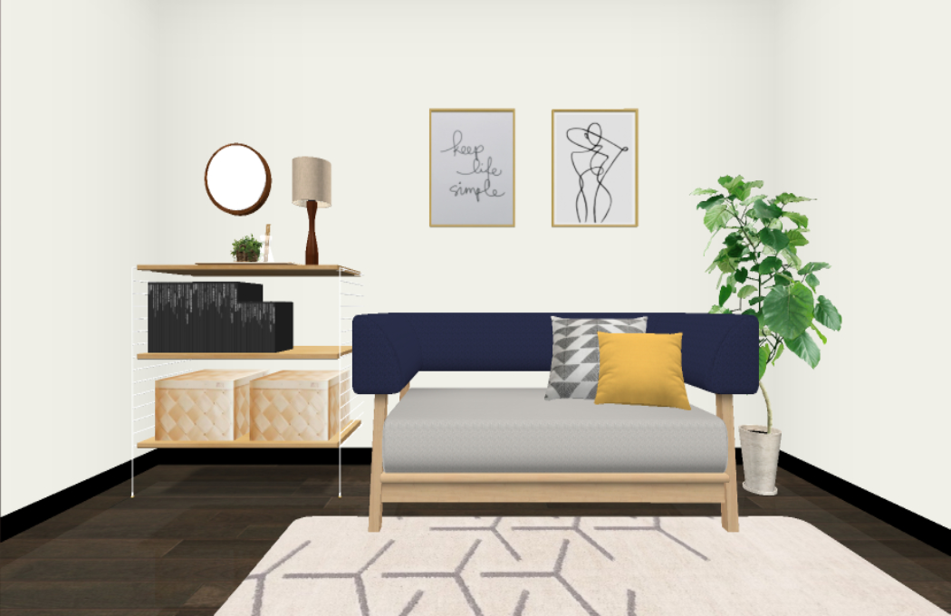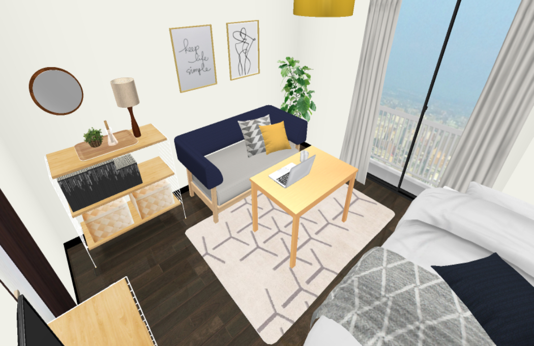 その周りを囲むようにして、ソファーやお持ちのシェルフ、ベッドを配置いたしました。