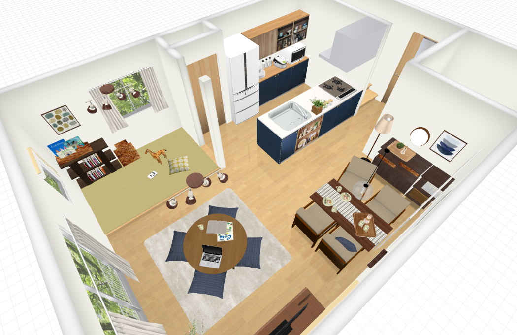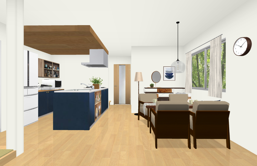| 伝えたい内容など | 新築で12月引っ越し予定なので、内装写真がありません。 床はハードメイプルという素材で、キッチン上部にナチュラル?ミドルブラウンの下り天井が入る予定です。 キッチンとカップボードは内装写真に添付したような パナソニックのネイビーオークかブルーグレーオークのものが入る予定です。 TVは32インチですが、買い替えも検討しているので、 大きめのテレビボード180cmサイズか150cmサイズを希望しています。 テレビの配線は東側の壁、やや南寄りについています。(畳スペースと反対側) 畳スペースは一般的な緑色の畳が入る予定です。 |