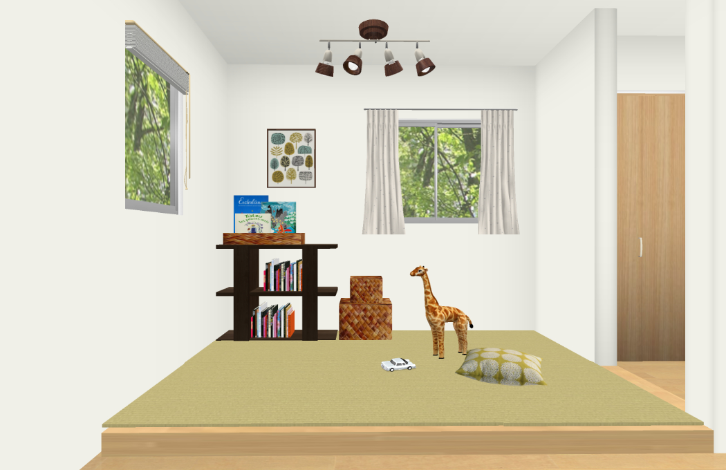 また、畳コーナーは、おもちゃを収納できるシェルフを置いて、お子様のプレイコーナーとしました。