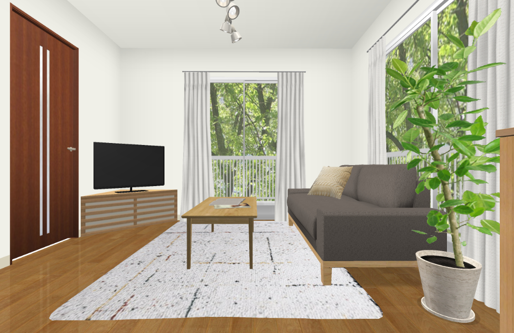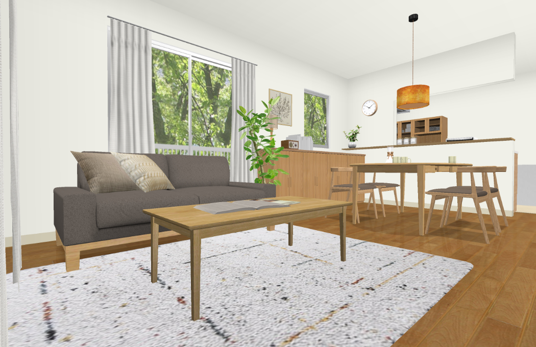ソファーやTVボードのリビングアイテムはそのままに、ダイニングセットやラグ・カーテンなど、
