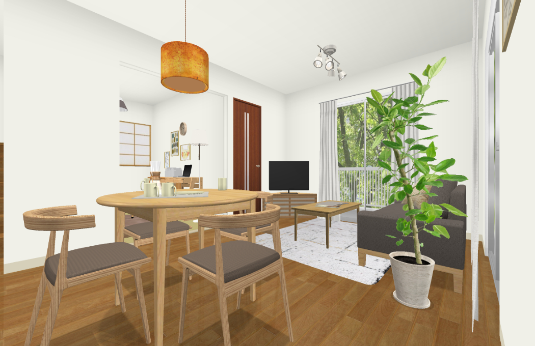 配置する家具やラグは、LDKのナチュラルコーディネートと統一感を出すため、明るめの木製家具で揃えて、
