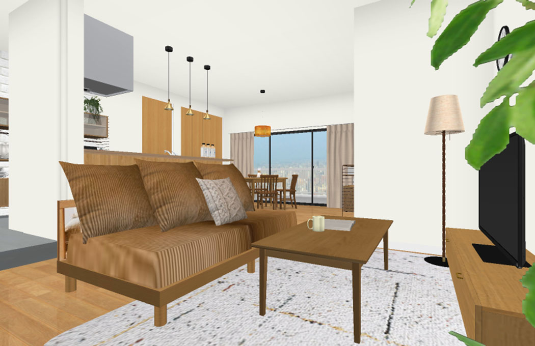 リビングには、ご希望イメージで頂戴しておりました【 3人掛けソファー AGRA-BROWN 】をレイアウトいたしました。