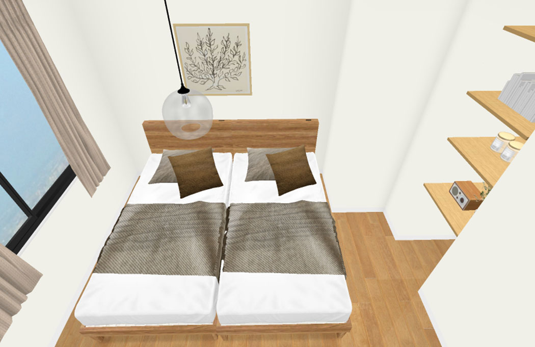 図面上ではシングル2台の記載がございましたが、ヘッドボード側の壁が幅200cmでしたため、シングルサイズ2台置きではフレームでぴったりになるため、掛け布団カバーが通路側にはみ出ます。