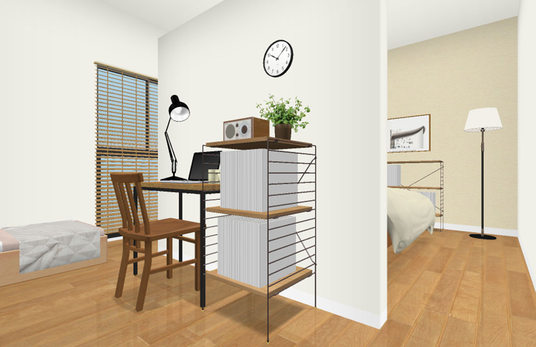 また、ワークスペースには【 デスクWIRY 】と【 ユニットシェルフR.U.S基本セット 】をレイアウトいたしました。
