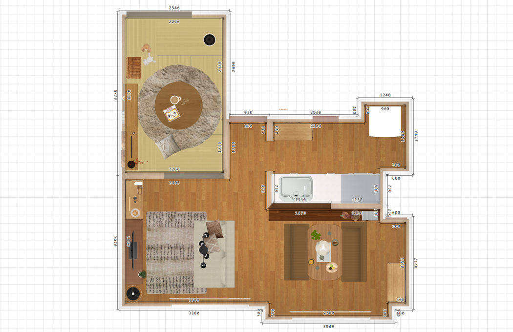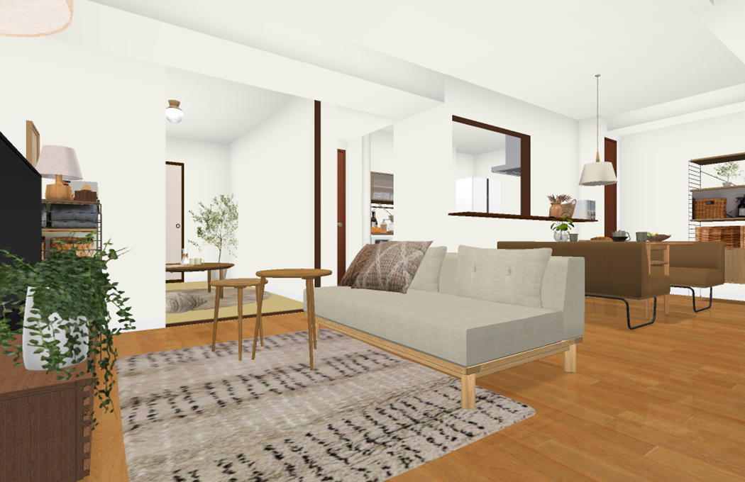 キッチンカウンター前には、ダイニングスペースと収納アイテムを、和室前には、リビングスペースを設けました。