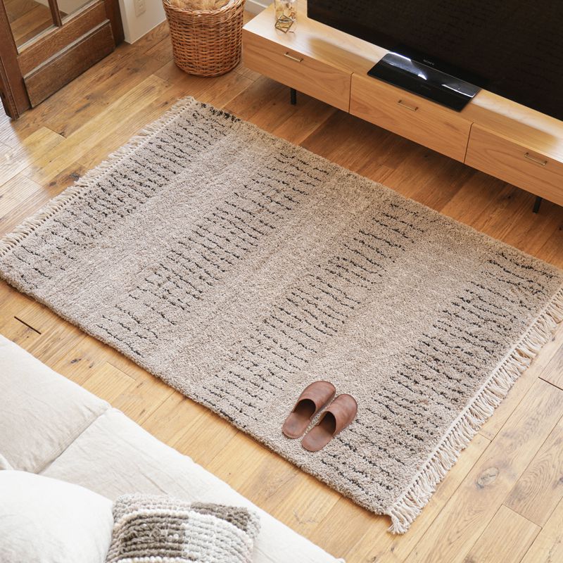 空間を彩るアイテムとして、ソファー前には【 ラグマット BOHO 】の「サンド×ブラウン」カラーを敷きました。