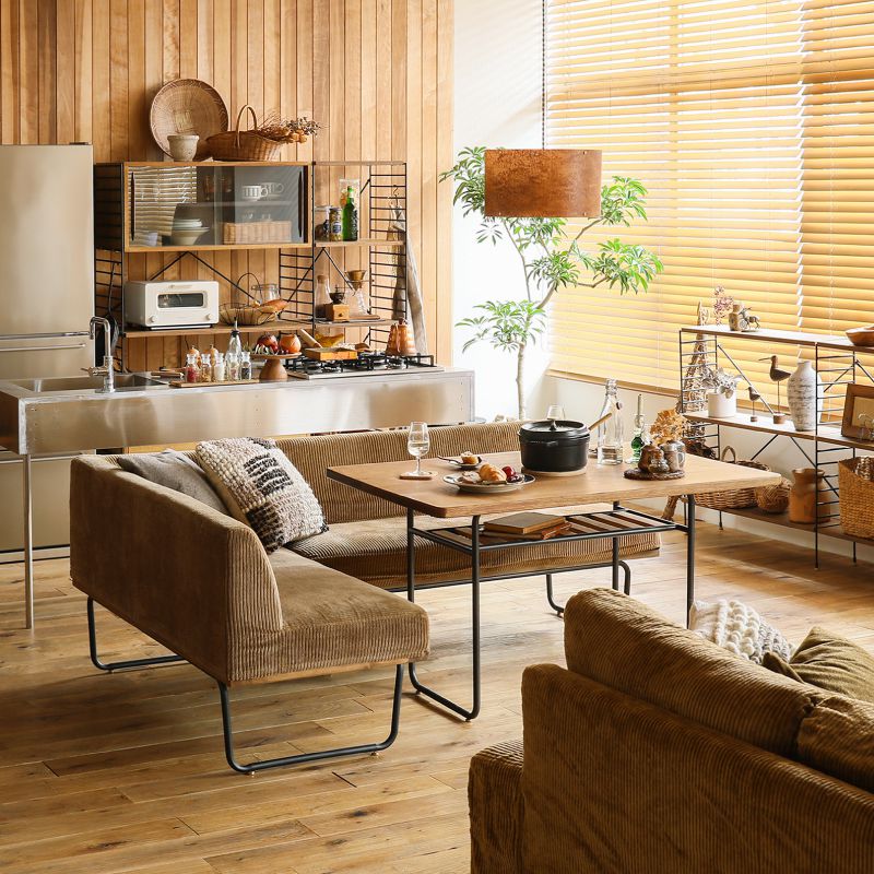 ダイニングのチェアーには、【 2人掛けソファー WIRY 】と【 カウチソファー WIRY 】を「キャメル:コーデュロイ生地」で合わせました。