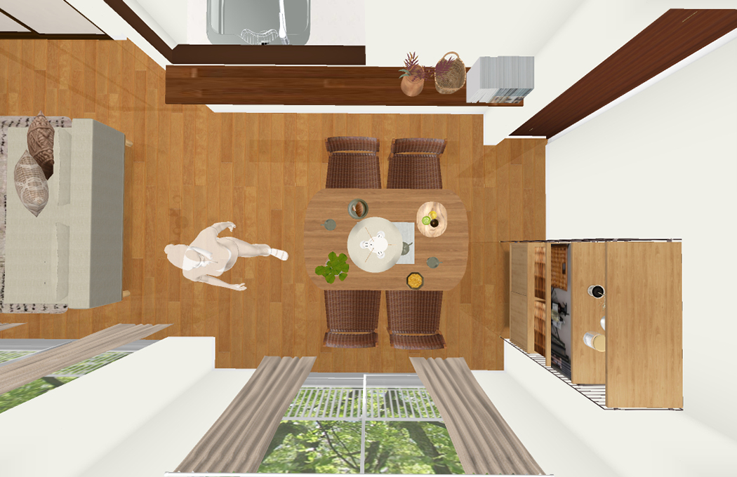 もとのレイアウトでは、ダイニング奥への行き来が難しいご様子だったため、テーブルの配置は、キッチンカウンターと「垂直」に設置いただくのが最も効果的かと存じます。