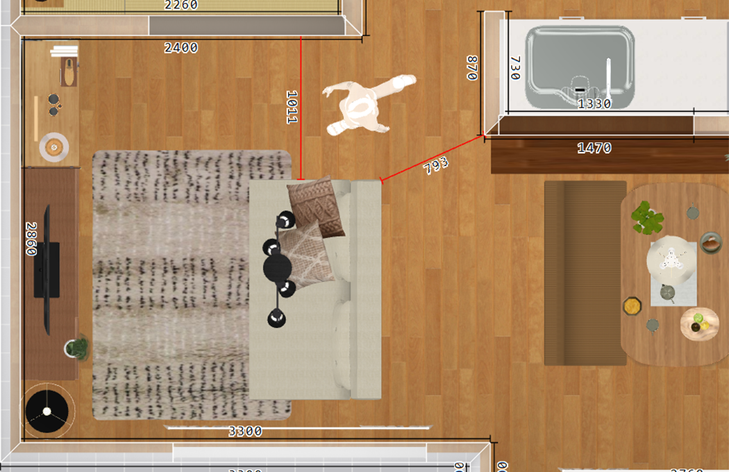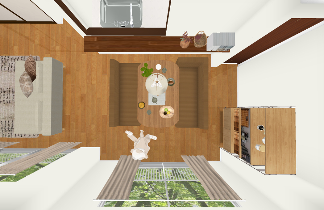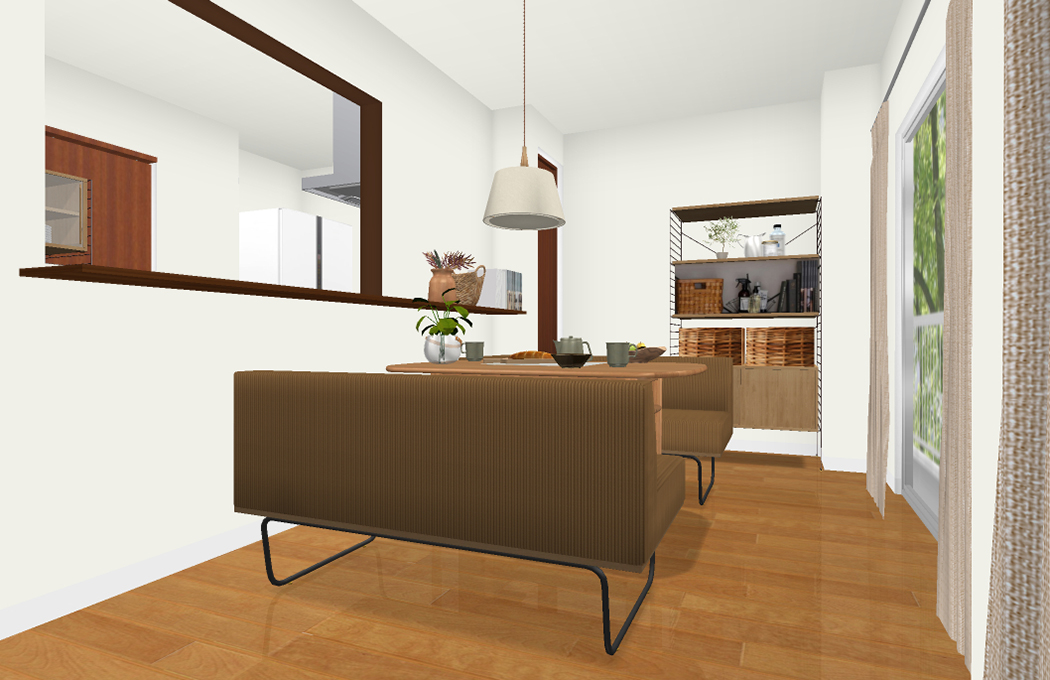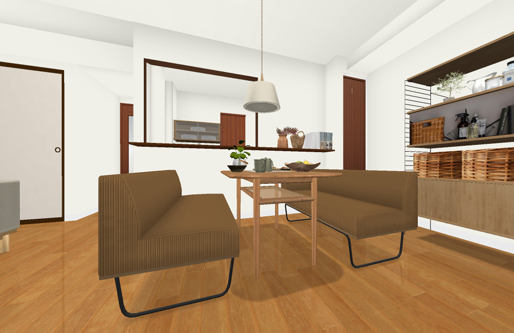 お食事を運んだり、ダイニングソファーに座る際の導線を妨げずに、ゆったりとお食事をお楽しみいただけるレイアウトです。