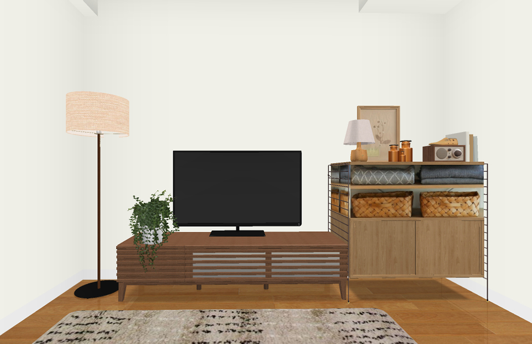 テレビボードに横並びで【 R.U.S 基本セット 高さ91cm×幅92cm(ウッドキャビネット)】も配しておりますので、リビングの収納力もカバーしています。