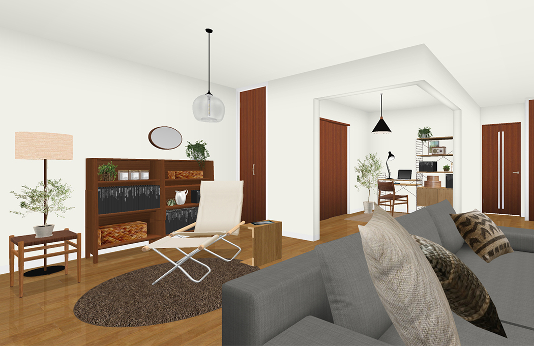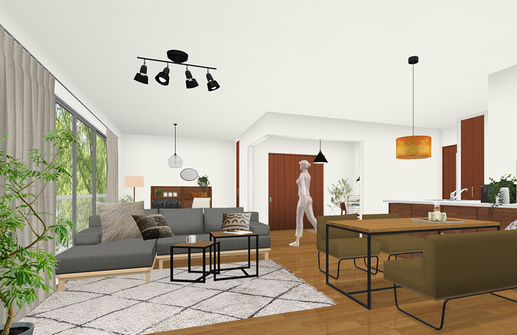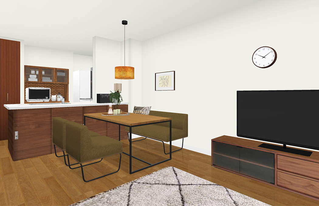 ソファー、ダイニングセット、キッチンボードは、ご希望いただいたアイテムをレイアウトいたしました。