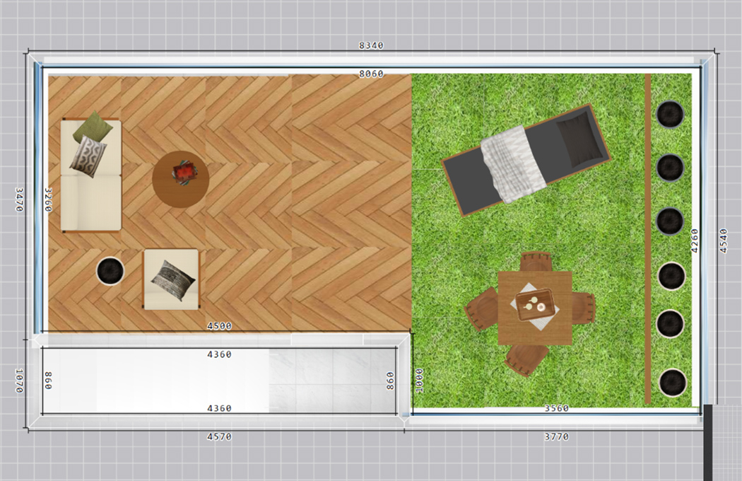 壁面片側に、植物を植えたりできるようなプランタースペースを設けていただくと、より緑豊かなガーデン空間となります。
