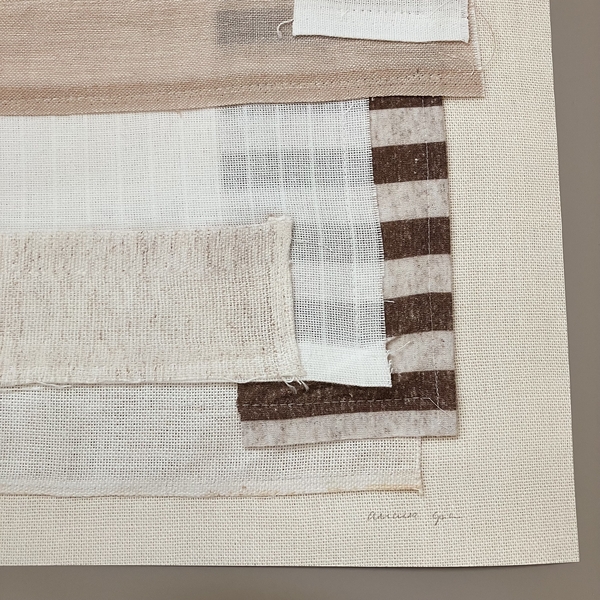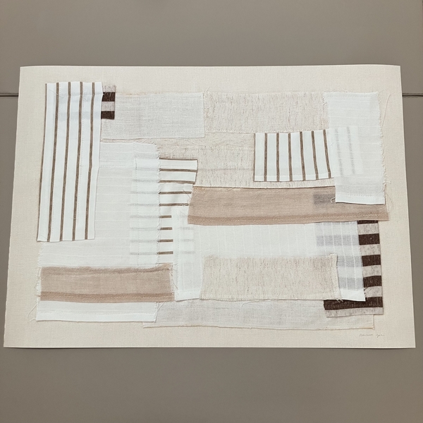 特に、数種類の布を貼り合わせたものや直線的な幾何学模様など抽象的なアートを多く展開しています。