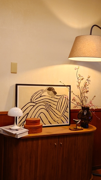 まずはリビング。定番のサイドボード上にアートを取り入れました。