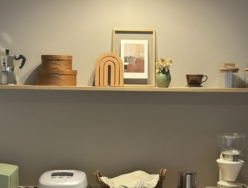 例えばお手洗いの壁。何もないと、のっぺりとした印象になりがちですが、お気に入りの写真や小さめのアートを飾ることで、洗練された空間になりました。