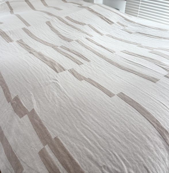 130 x 180cmなので、シングルサイズのベッドであれば、左右の落ち方も美しく、ぴったりのサイズ感です。