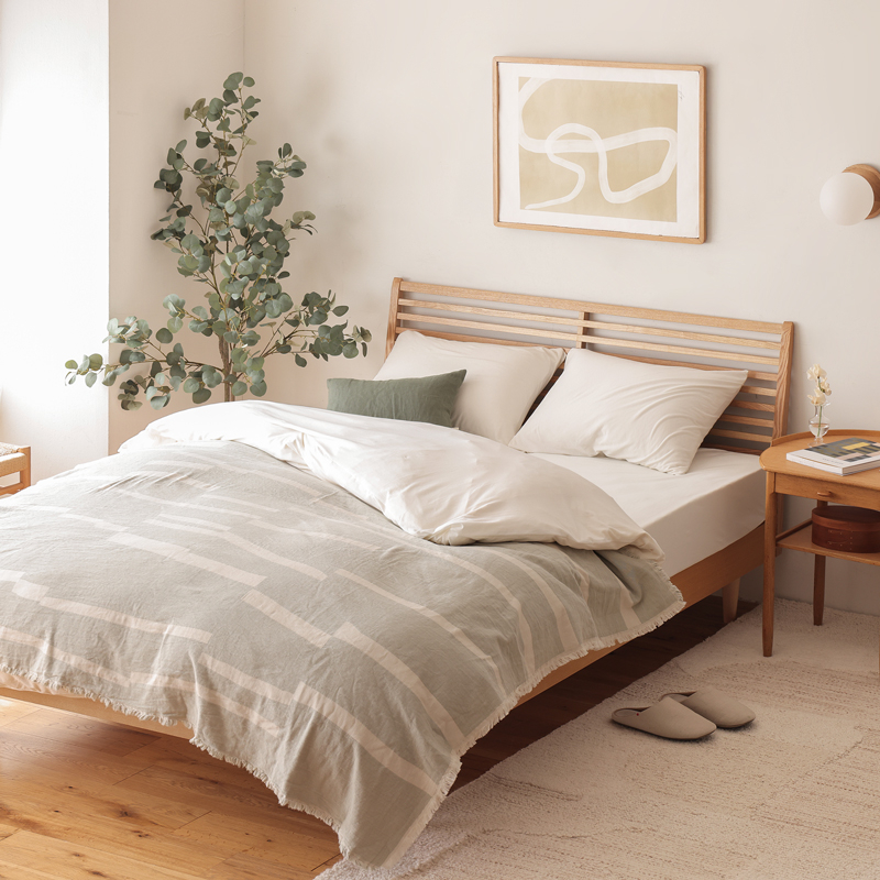 そんなベッドに、Lyme Grassを広げました。その淡いカラーは、涼しげな印象で春夏にぴったり。パッと寝室が華やぎます。