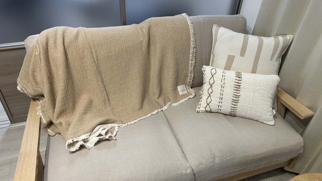 冬場に活躍するウール素材のものや毛足の長い毛布から、コットン素材の「Thyme」に交換してお部屋の季節感をガラッと変えることができます。