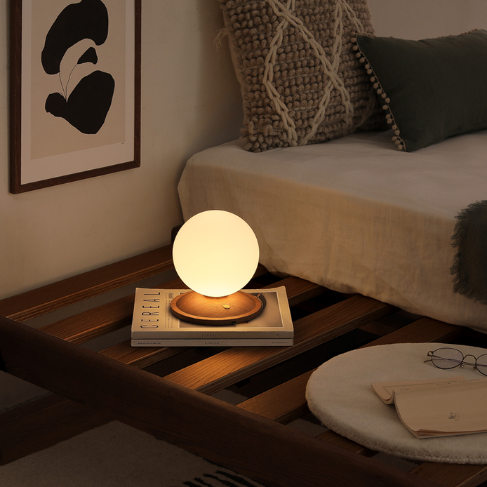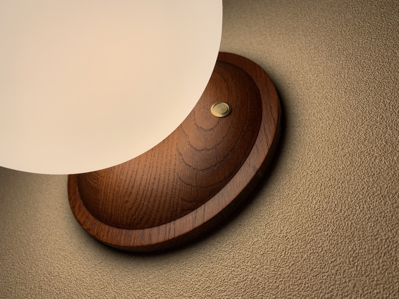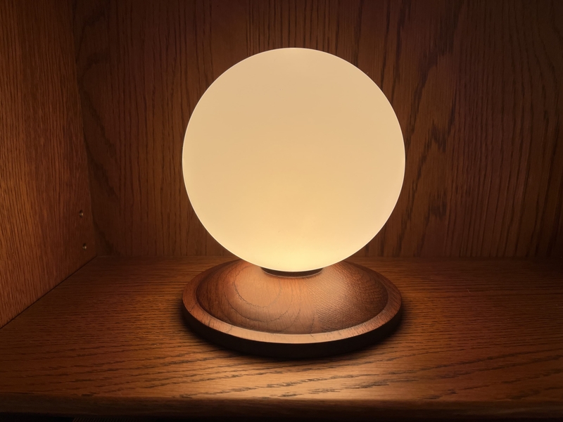 「Lumoa」は、味わい深い木製の台座に、球体のシェードを取り付けたシンプルかつ美しいデザイン。