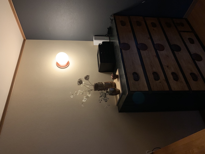壁に浮かせて設置するため、下にモノがあっても大丈夫。フロアライトなどの床置き照明に比べ、場所を取らない「省スペース性」が魅力です。
