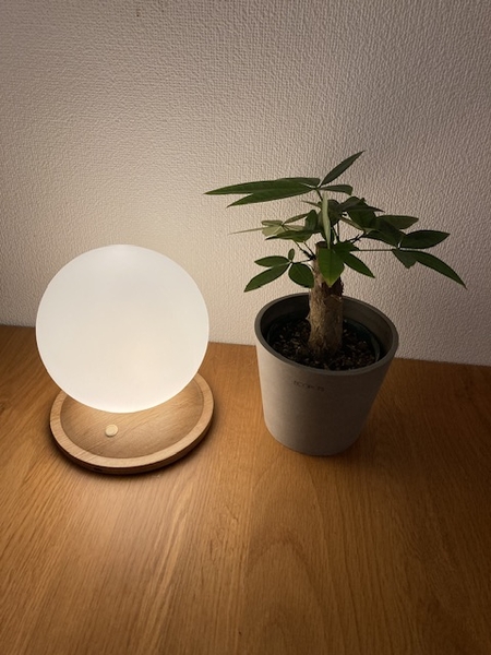 まんまるのシェードと、木のぬくもりを感じる台座の美しさも特徴です。