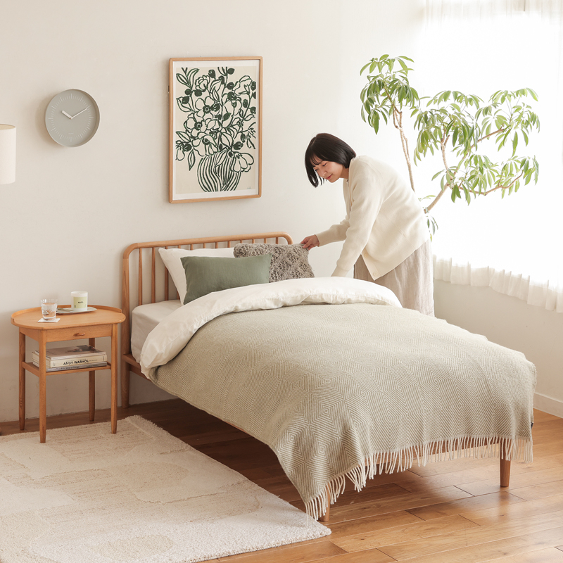 コッパー/ホワイトがおすすめなのは、柔らかな淡い雰囲気のコーディネートです。クッションやアート、ブランケットなど、赤みを帯びたアイテムをお持ちなら、銅フレームとの相性ぴったり。ぜひ取り入れていただければと思います。