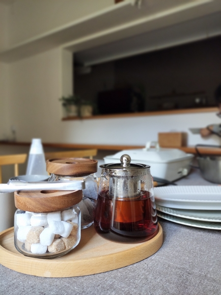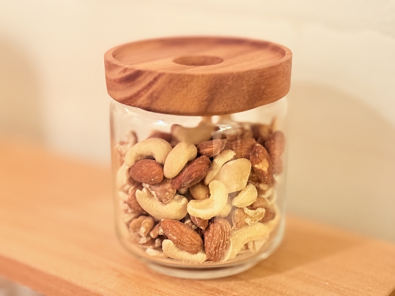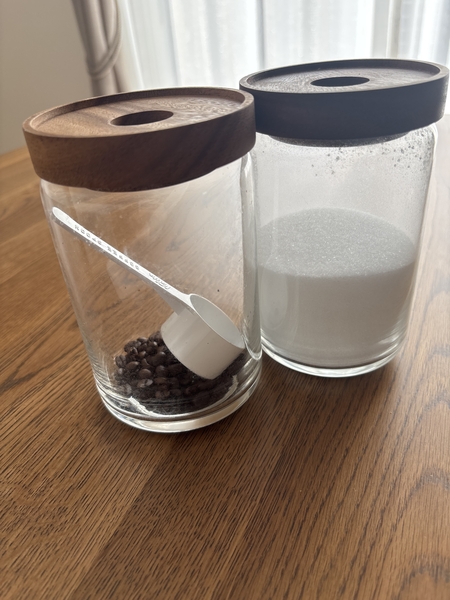 ガラスの容器にウッドの蓋がついているだけの、いたってシンプルなデザイン。シンプルがゆえに散らかって見える要素が排除され、入れて並べただけなのに、このように整って見えます。