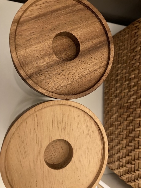ガラスジャーのサイズにぴったりな、専用のオーバルトレーもご用意しました。蓋と同じアカシア材を使い、見た目にもすっきりと収まります。また、一度に複数を移動できるので、ジャンルごとに分けてのせておくと便利です。