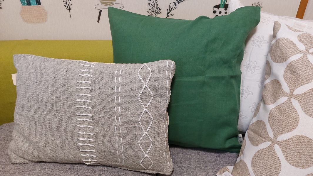 ソファの色が萌黄色で刺し色に緑色のカバーを探してました。