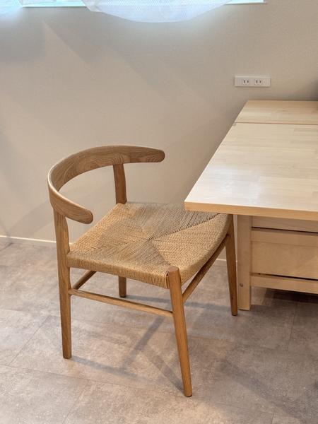 ひじ掛けのあるチェアは、自然な体勢で肘置きとして使えて、長く座っている中で、体勢を崩して座ることが出来るので、使いはじめると癖になる良さがあります。