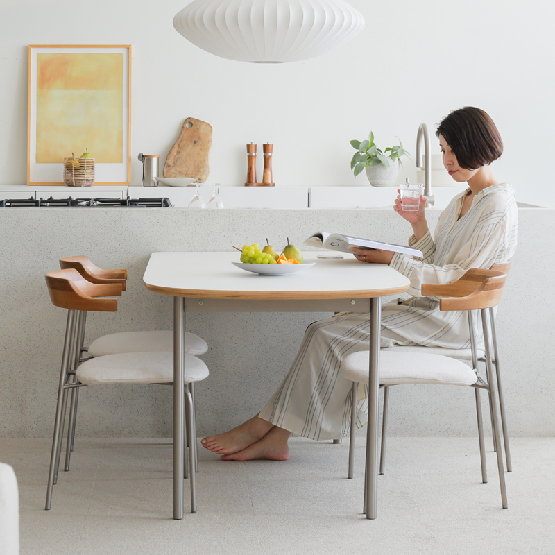 ウッドフレームチェアは、すっきりとした見た目に仕上げているため、軽やかさを感じるテーブルとも相性抜群。
