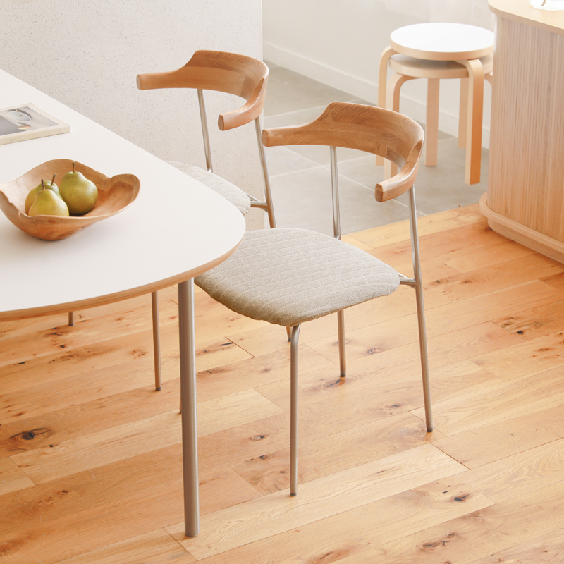 ダイニングチェア「Pair」ならではのすっきりしたデザインは確保しながら、脚部や素材によって、あたたかみを加えたアイテム。