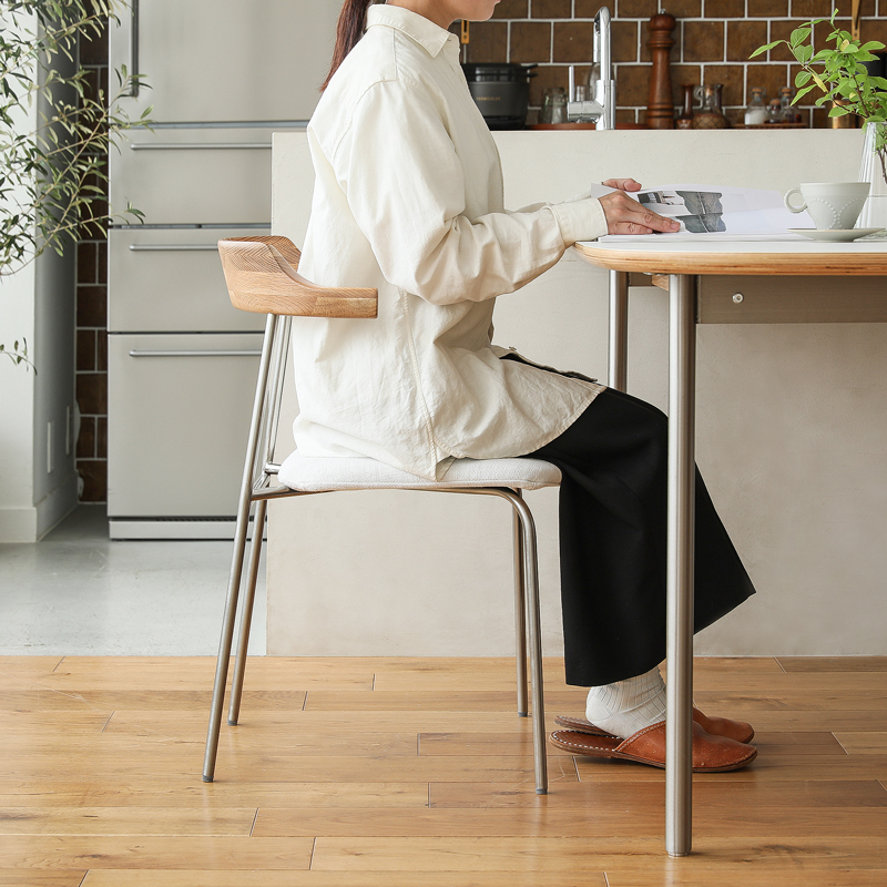 そこで私たちは、「アーム付きならではの快適さ」はそのままに、「ダイニングに収まりやすいサイズ感」を両立させることを目指しました。