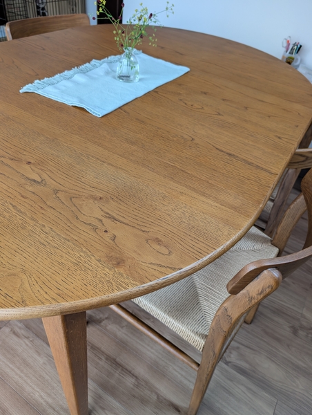 このダイニングテーブルは、奥行き(直径)が110cmあります。普通のダイニングは80cmくらいが多いですから、ずいぶんと贅沢なサイズです。
