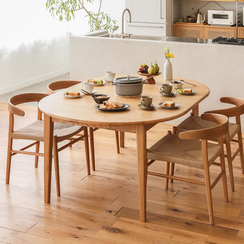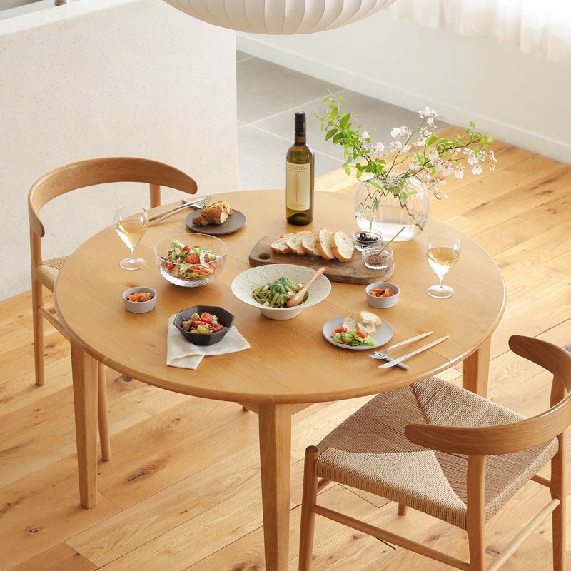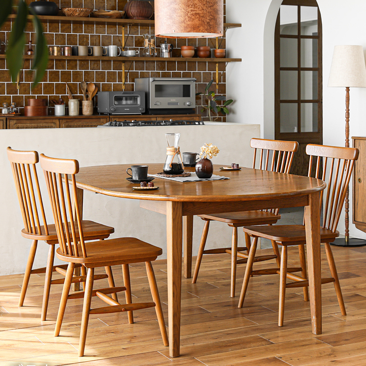 幅 110cmの円形から、幅 170cmの楕円形に可変が出来る、伸長式のダイニングテーブル。家族の成長や人数、シーンに幅広く対応し、生活にフィットします。