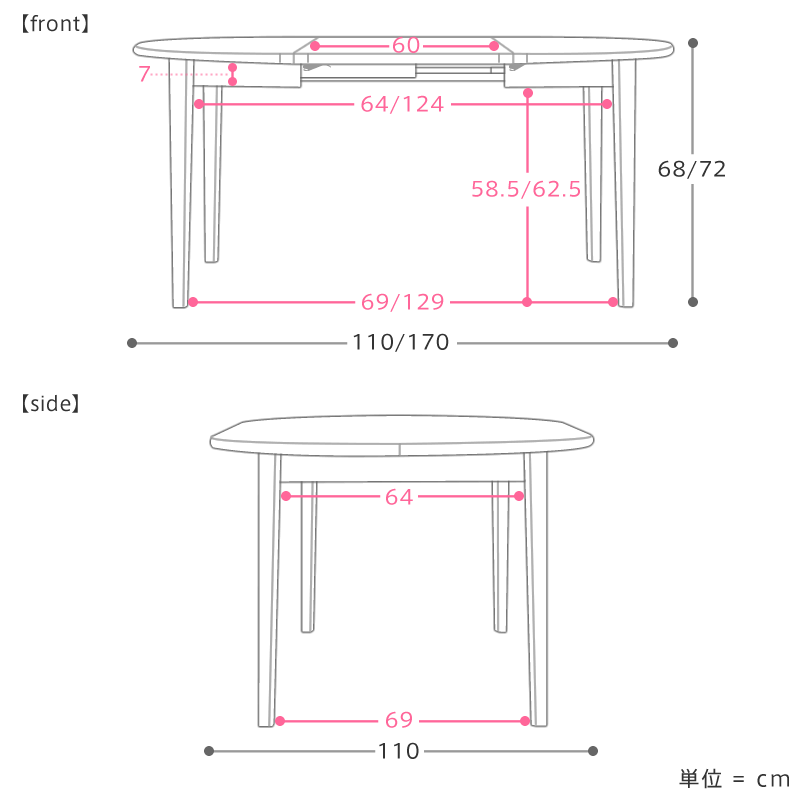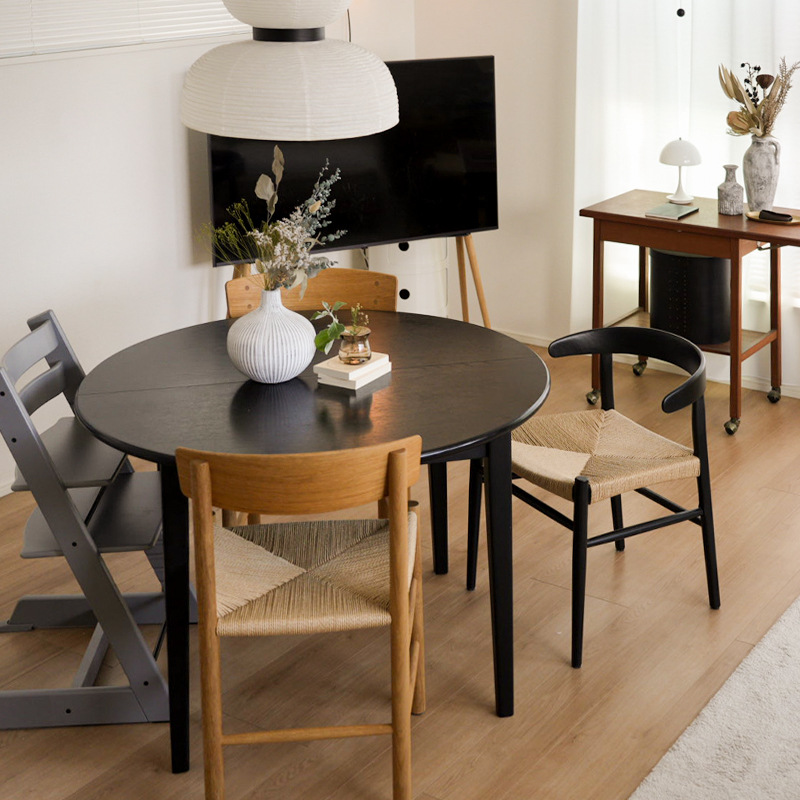 エクステンション天板を取り外すと、110cmの円形になり、エクステンション天板を付けると、170cmの幅広の楕円形ダイニングになります。