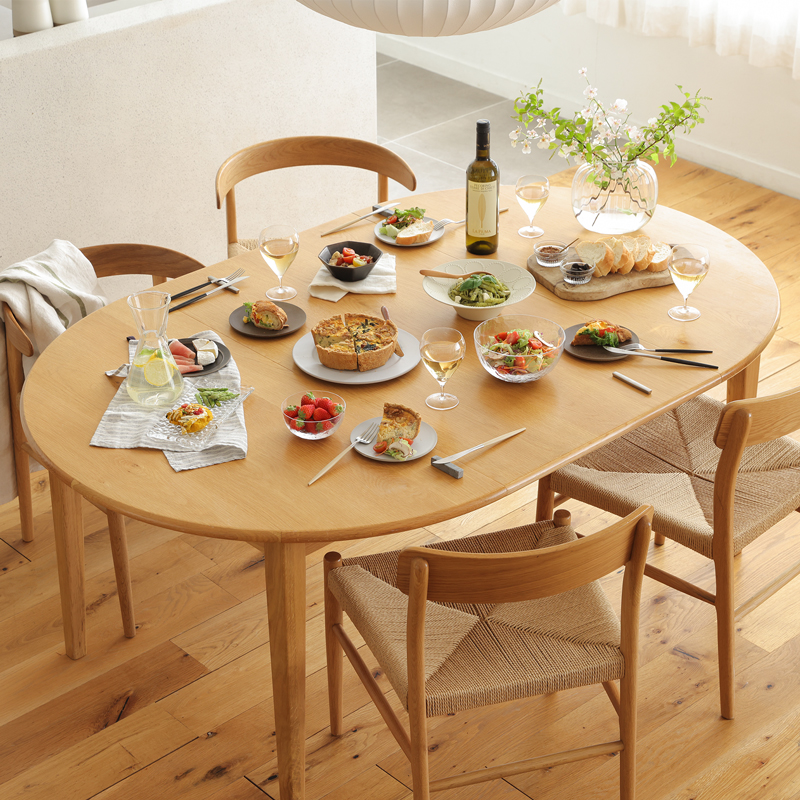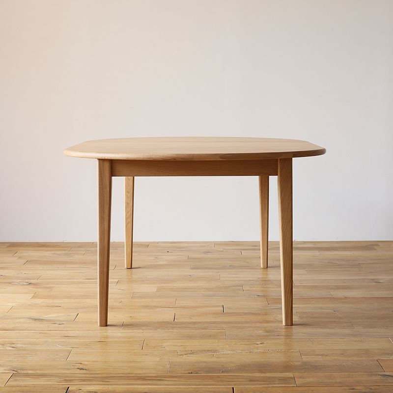 伸長式ダイニングテーブル「folk(フォーク)」は、オーク突板天板とオーク無垢フレームを使った伸長式仕様。