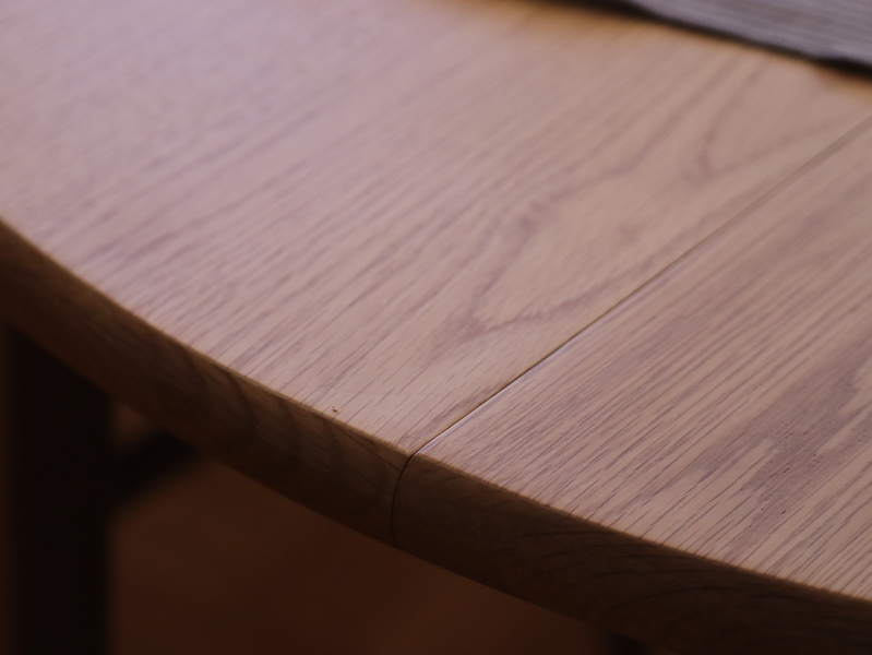 同じ楕円形のダイニングテーブルを作る際に、バタフライ・スライド式は伸縮時は四角形に対して、エクステンション式は、円形になります。