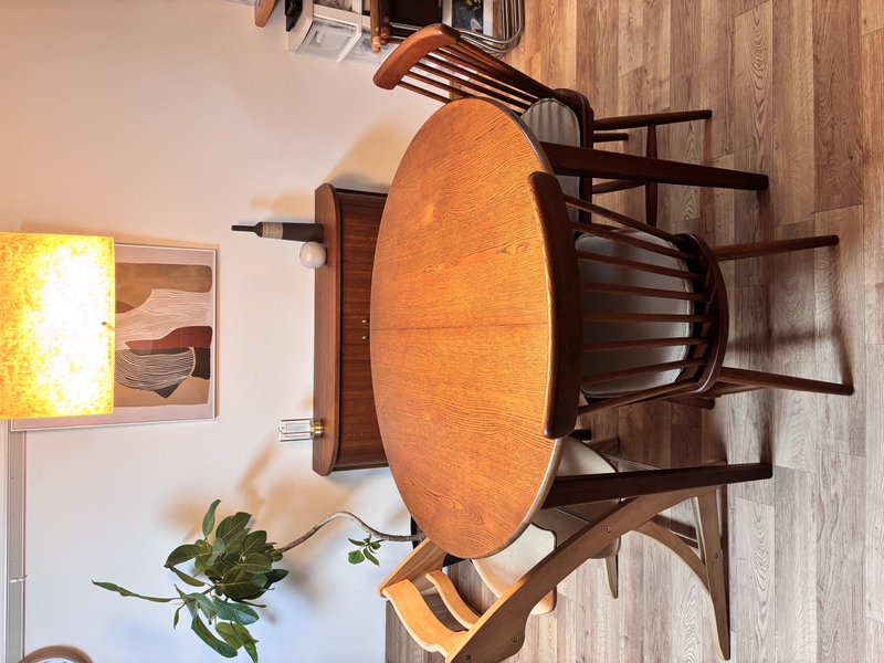 この仕様は、北欧ヴィンテージのダイニングテーブルでよく使われるのですが、大きな特徴として、伸長時に脚の位置も一緒に外側に動きます。
