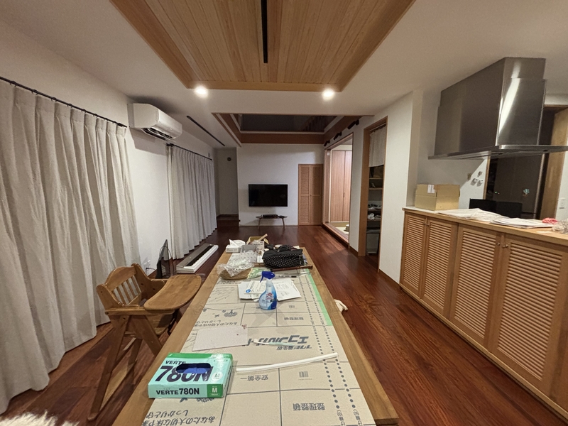 カーテンがない状態だと、夜は窓が黒い壁のようになり、窓の存在が強調されます。そこでカーテンを閉めると、窓が隠せて圧迫感の軽減に。
