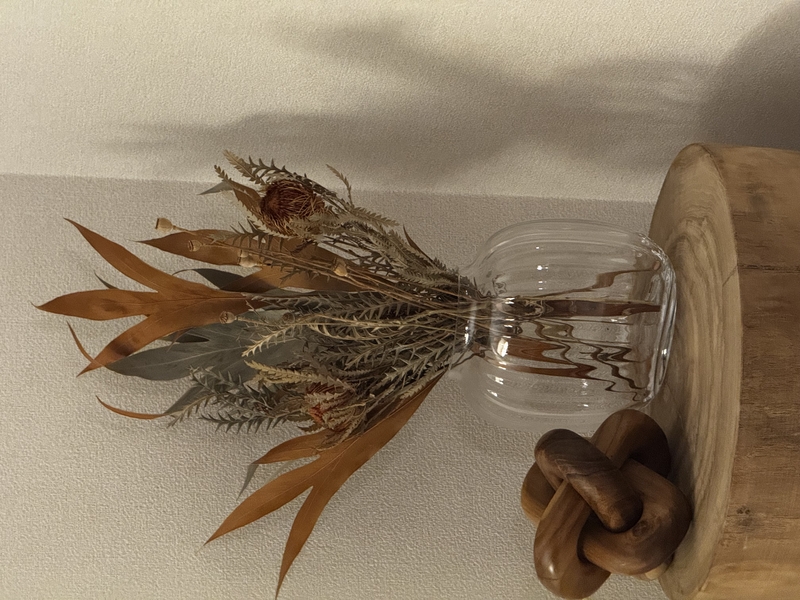 お花屋さんでよくみかけるユーカリやバンクシアなど、クセのないものをセレクト。どんなお部屋でも取り入れやすいまとまりに仕上げました。