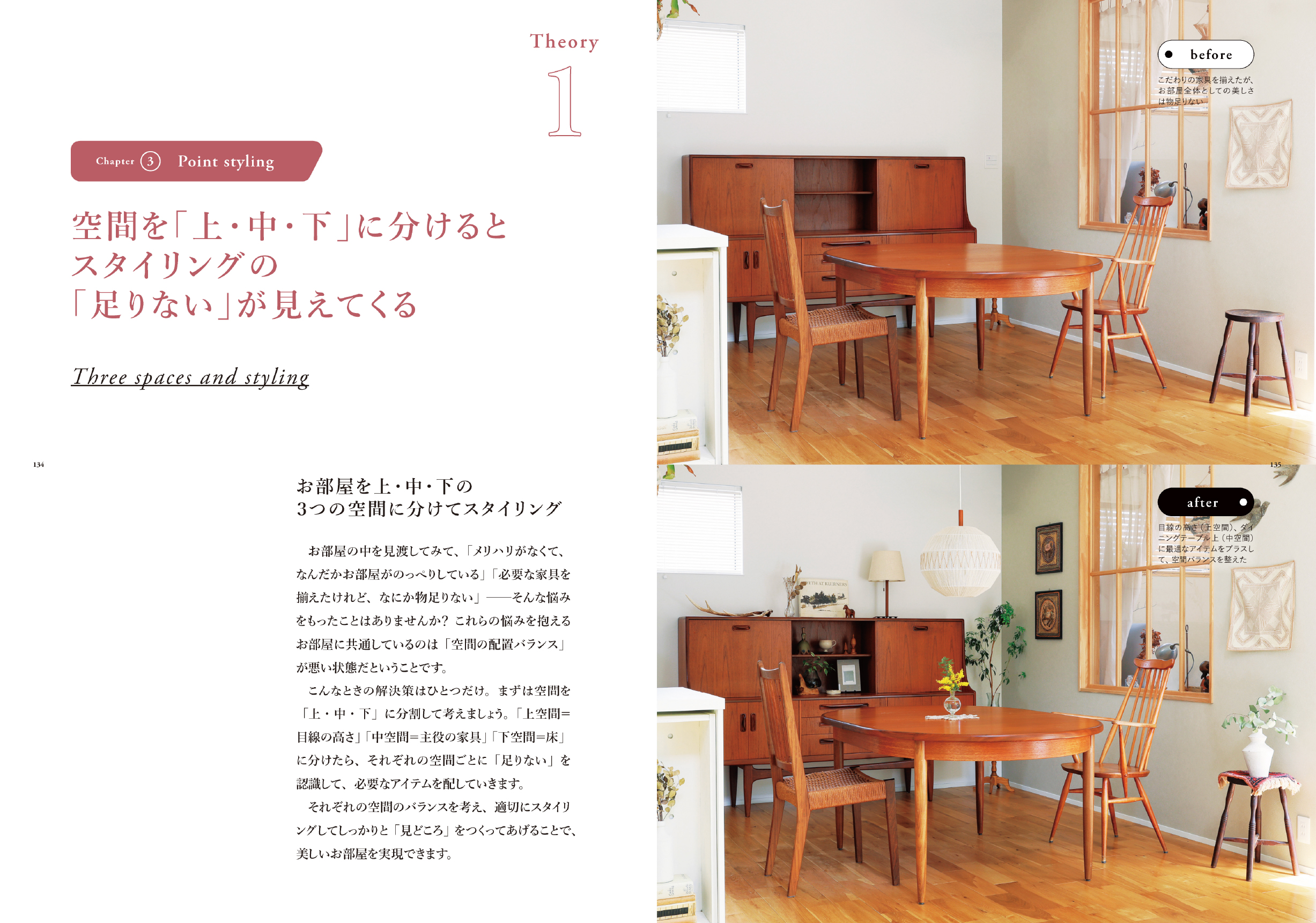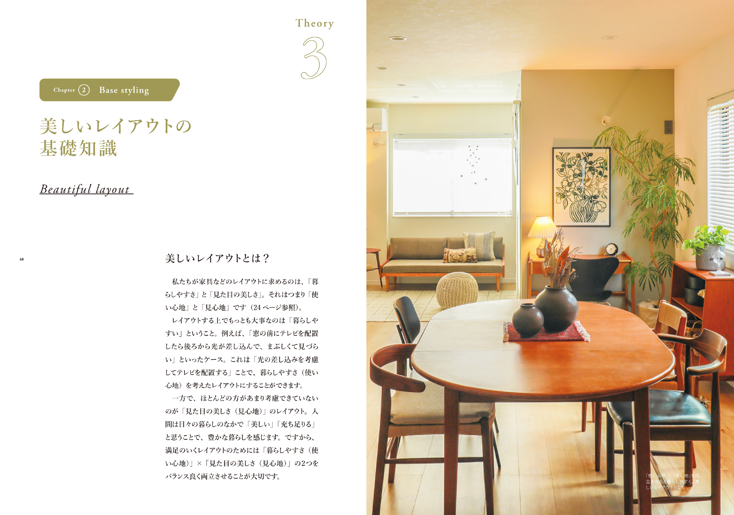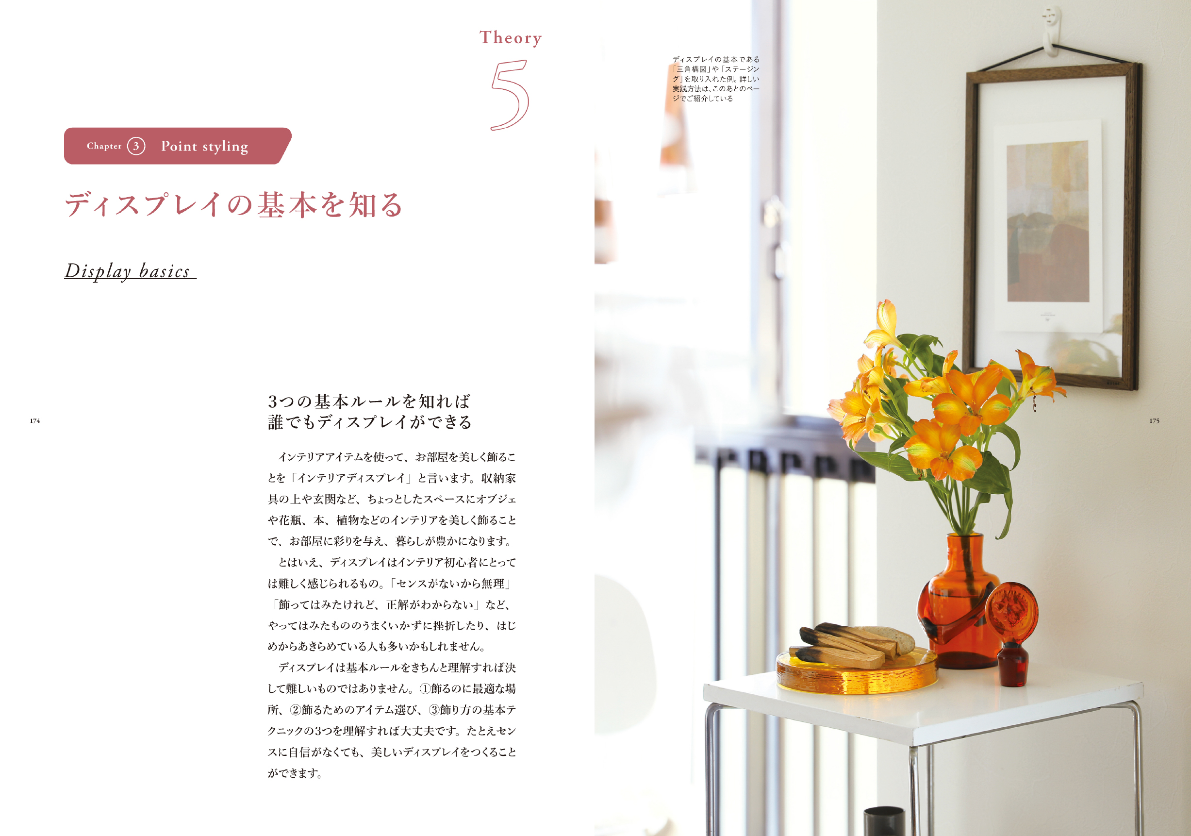 ページの構成は、①スタイリングをはじめる前に、②ベーススタイリングのセオリー、③ポイントスタイリングのセオリーとなっています。初心者の方でも、基礎から学んでいただけるように、インテリアの基本を丁寧に紐解きながら、前著よりも実践アイデアをたくさんご紹介しました。