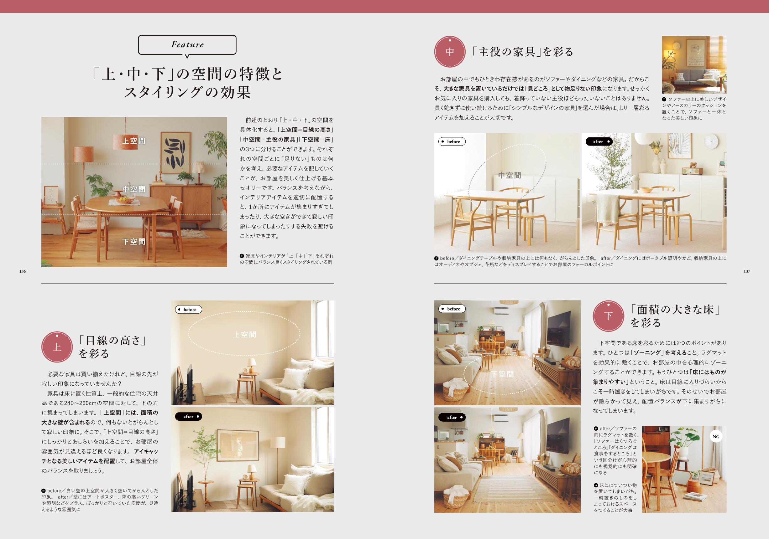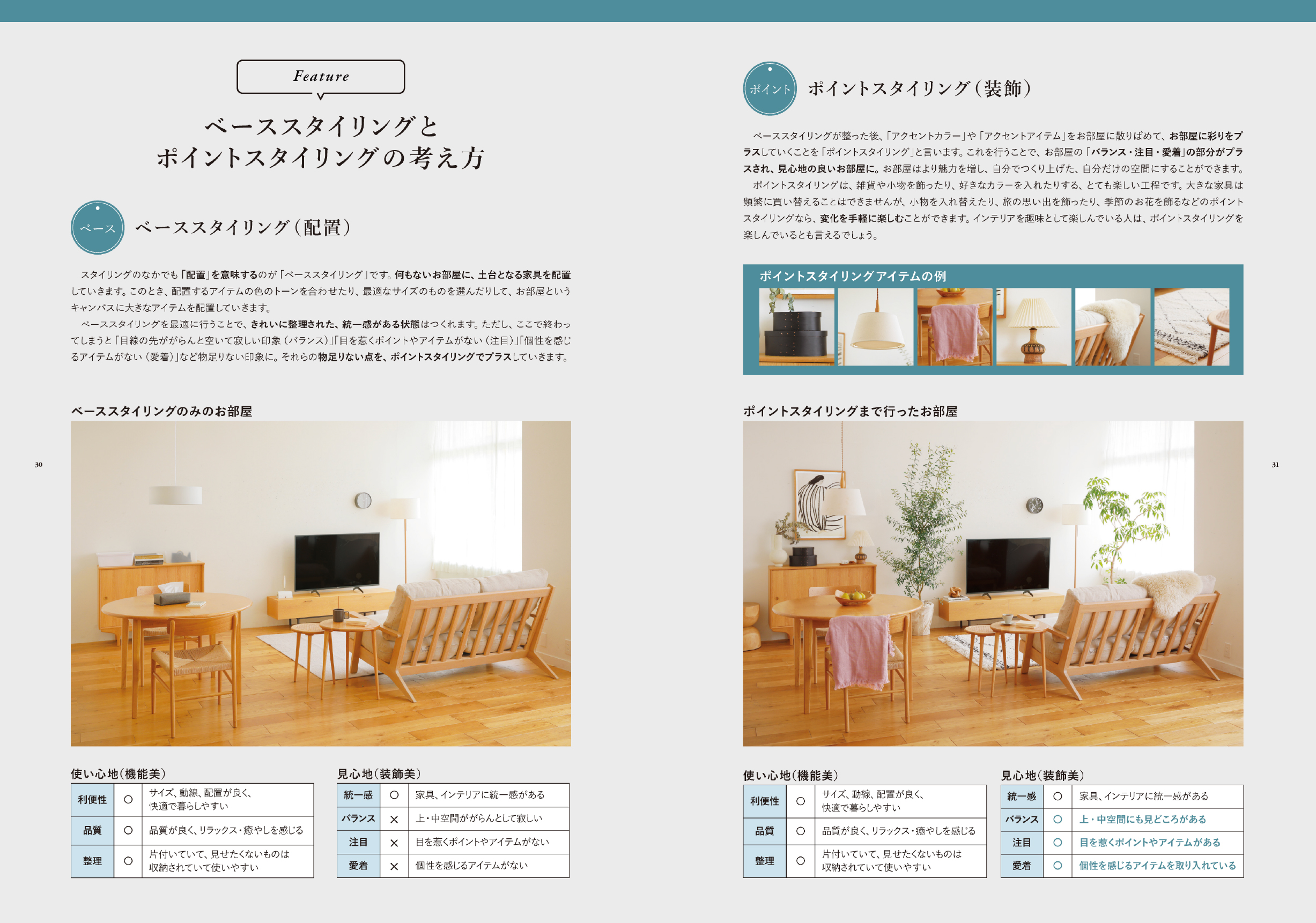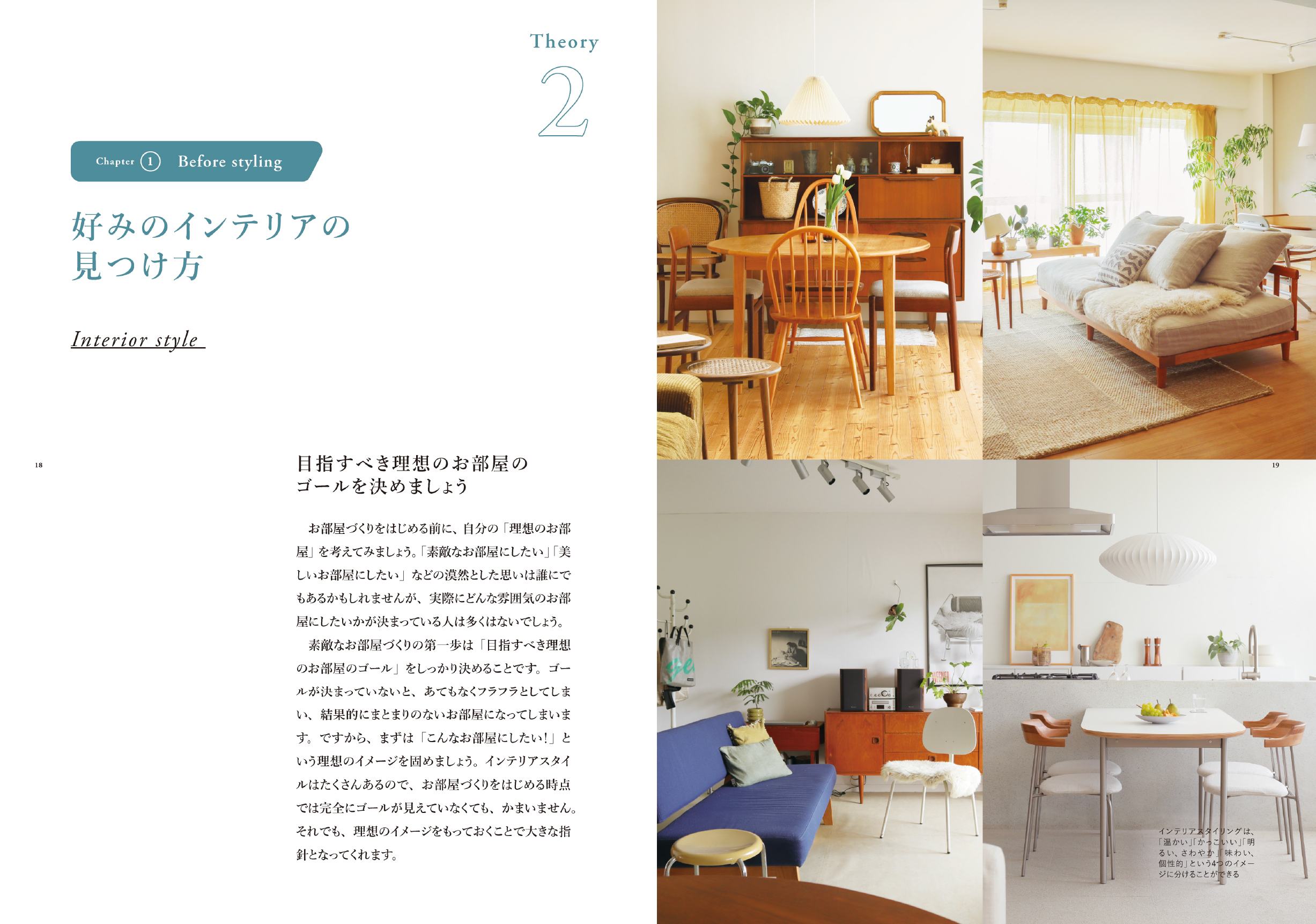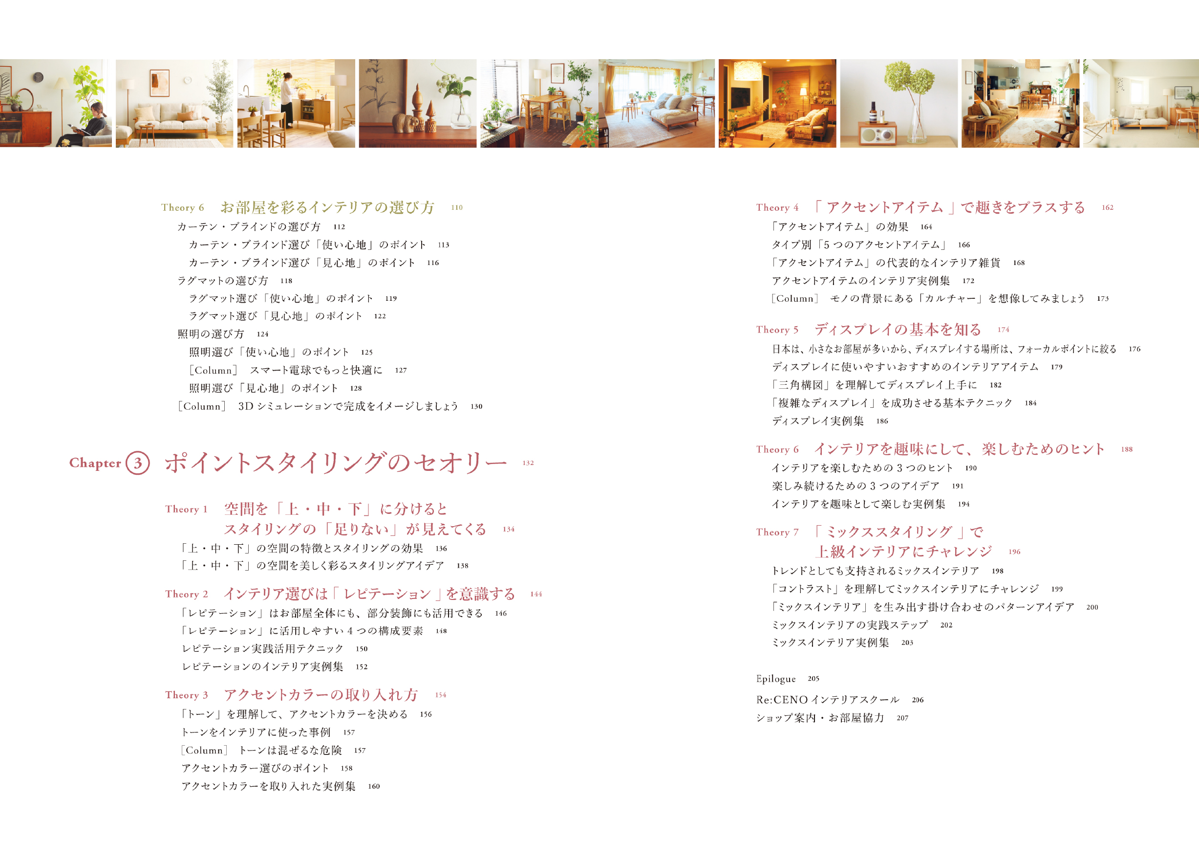 ページの構成は、①スタイリングをはじめる前に、②ベーススタイリングのセオリー、③ポイントスタイリングのセオリーとなっています。初心者の方でも、基礎から学んでいただけるように、インテリアの基本を丁寧に紐解きながら、前著よりも実践アイデアをたくさんご紹介しました。