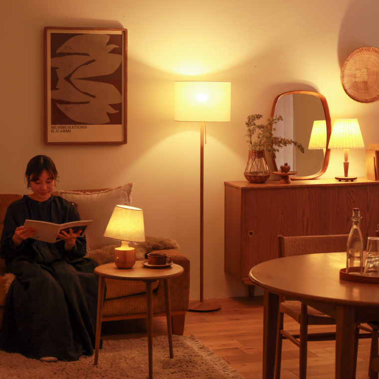 お部屋でゆったり過ごす時間には、電球の色味を「電球色」で統一するのがおすすめ。色味を揃えることで、落ち着いたリラックス空間を演出できます。